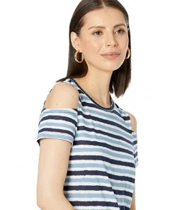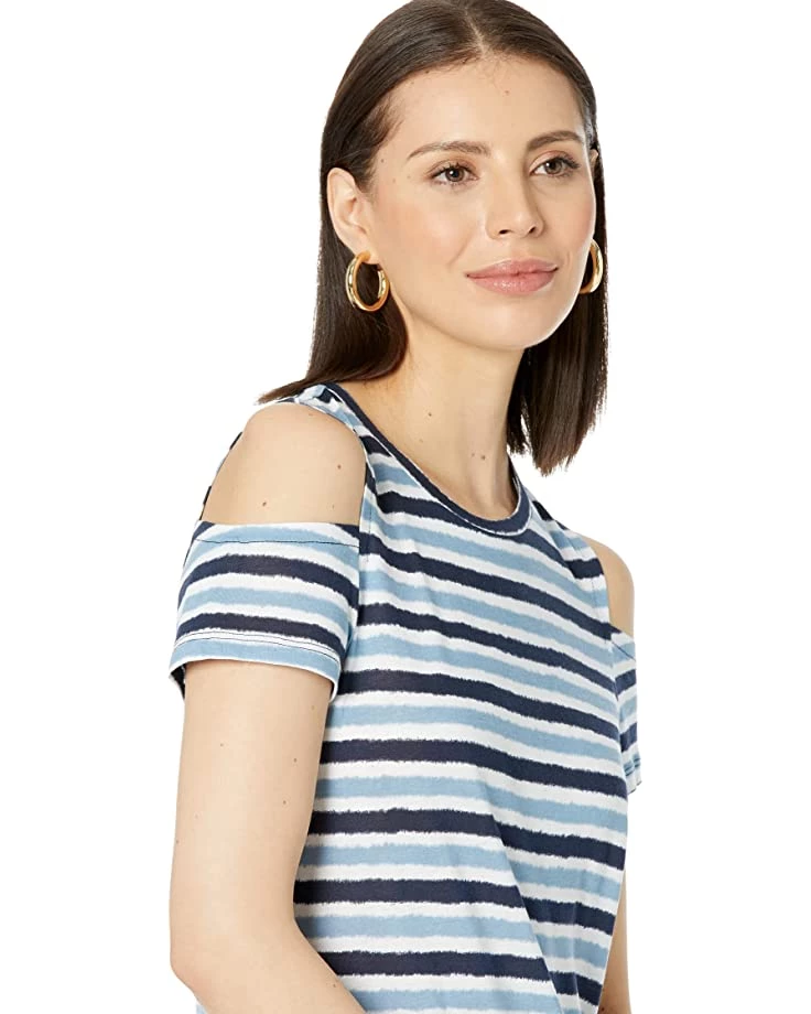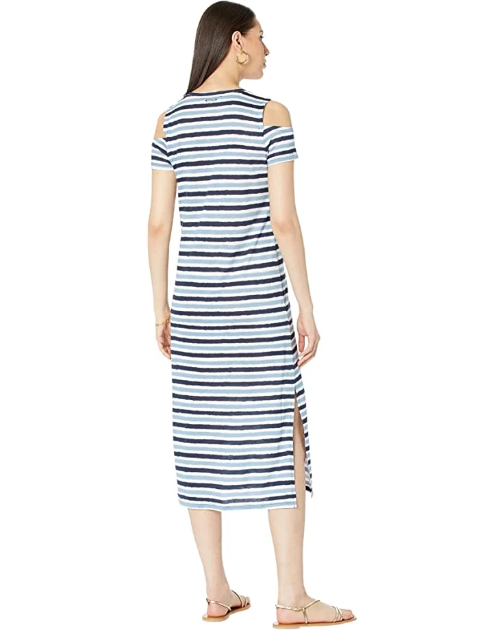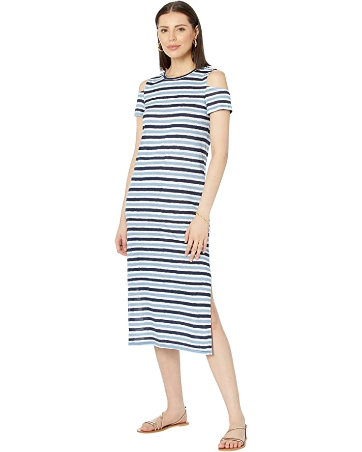 - With cut-out detailing on the shoulders, the MICHAEL Michael Kors® Ikat Stripe Cold-Shoulder Midi Dress keeps it simple and elegant.