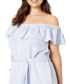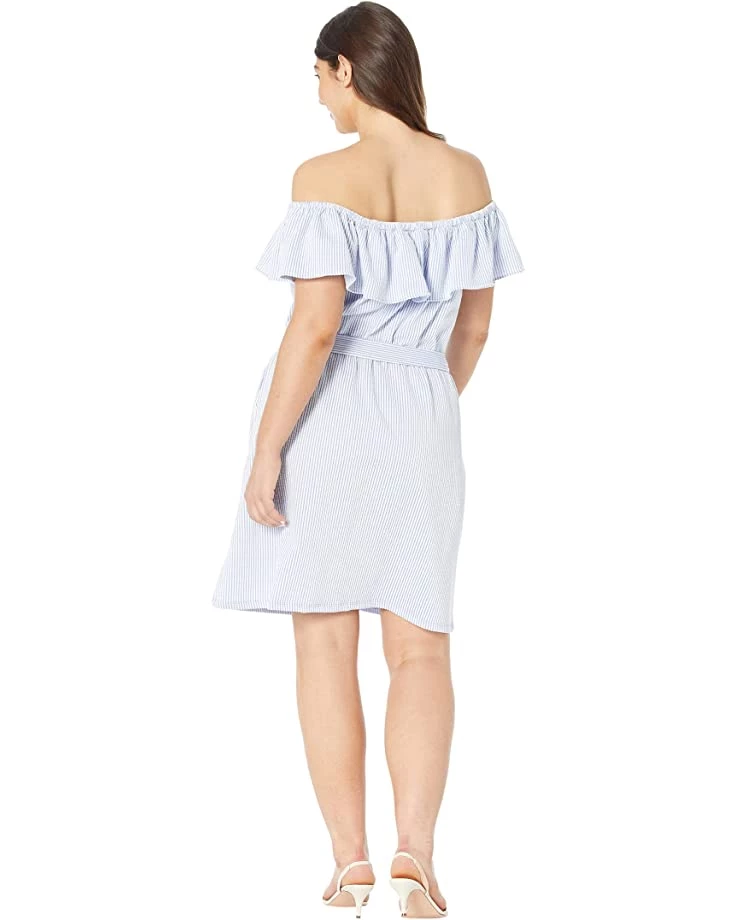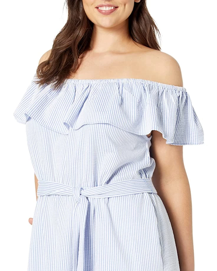 - Off-the-shoulder neckline with ruffled peplum detail.