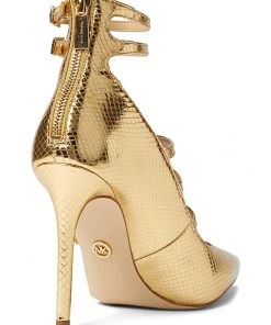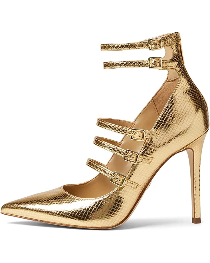 Gorgeous sexy shoe. The gold is shiny which is what I was looking for to match a dress. I am a size 8 and the 8 fit perfectly. Also, because of the straps and style, it holds the foot and is really comfortable even though it is a rather high heel that I would usually be unable to wear. This one is a keeper. Can’t wait to dance the night away in these at upcoming weddings.