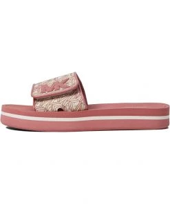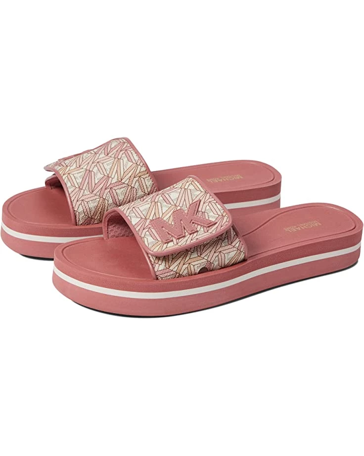 - Your friends will want to copy your style when they see you wearing the MICHAEL Michael Korsยฎ MK Platform Slide, with the large MK logo print on beautiful canvas material, a cushioned platform that will have your feet thanking you for all that comfort, and a open-toe slide on style sandal for easy on/off.