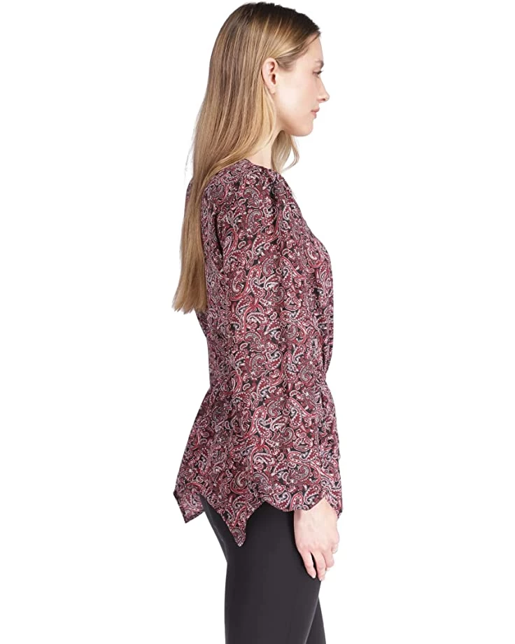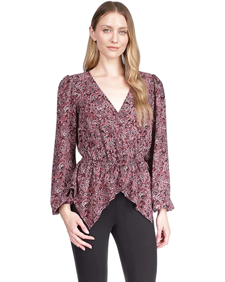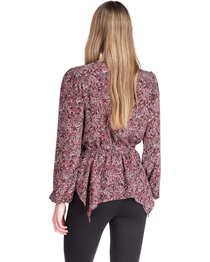 - MICHAEL Michael Kors® Pop Lux Paisley Wrap Top boasts a bold V-neck, cinched waist, and an asymmetrical hemline.