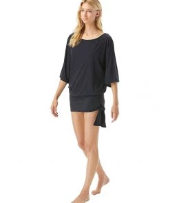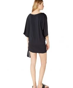 - Loose fit cover-up features a drape silhouette with a side tie at left thigh for a beach-ready look.