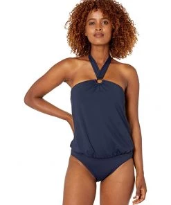 - Turn heads in the MICHAEL Michael Kors® Iconic Solids Logo Ring Trim Halter Blouson One-Piece With Hidden U Wire featuring a classic halter blouson one piece with logo trim and hidden underwire bra with removable soft cups including tummy control.